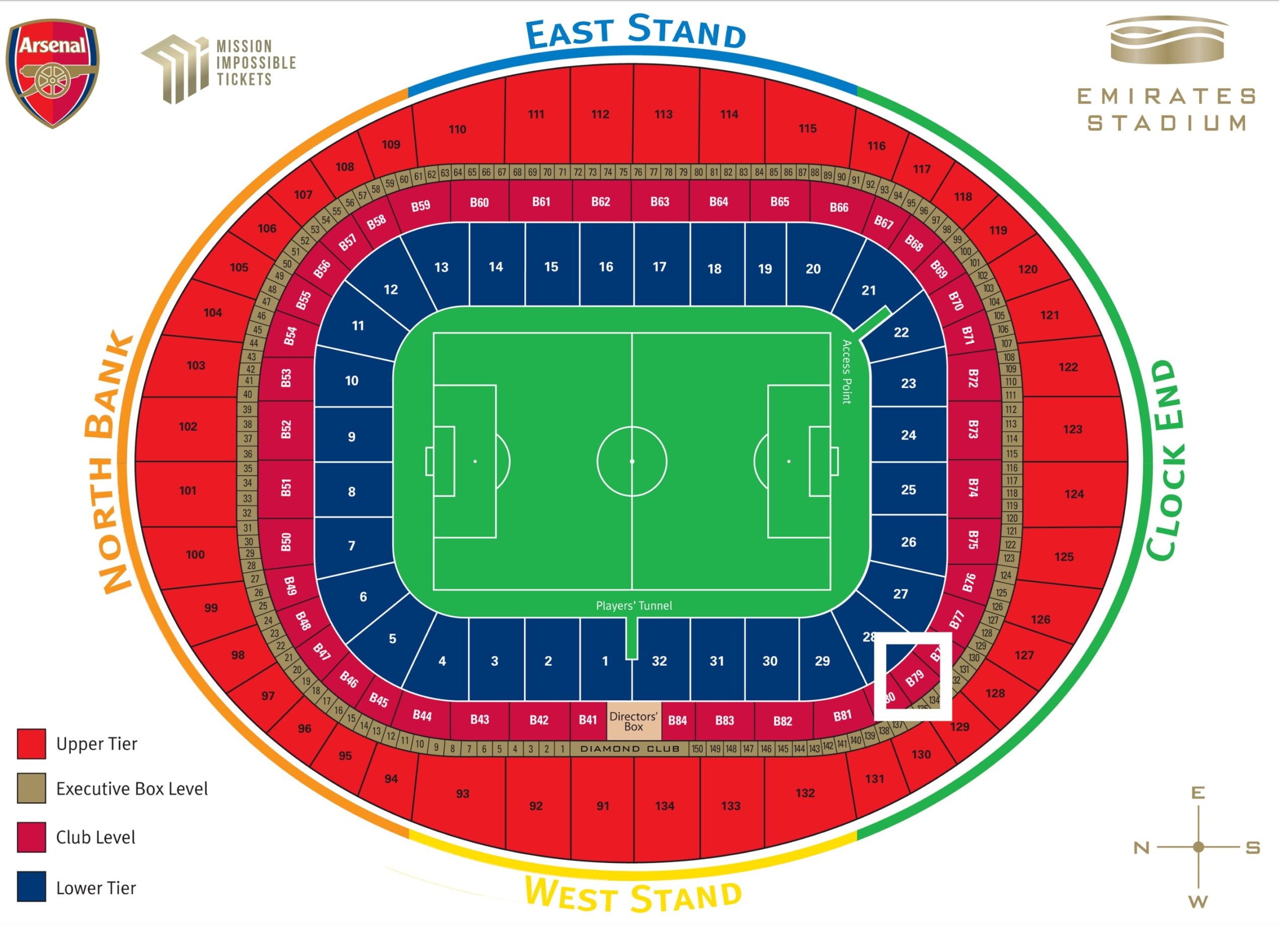 Cannon Club Level (Blocks 67–76): Premium padded seating across the middle tier, perfect for witnessing the tactical drama of the title run-in.